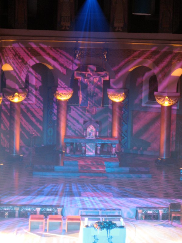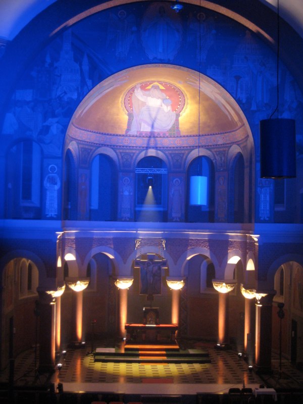 Aangezien de dansers en koren zich op verschillende plaatsen in de kerk bevonden, maar anderzijds de aanwezige stroomsterkte eerder beperkt was (32A 220V) werd geopteerd voor een 4-tal krachtige Vari*lites (type 3500Q) die op verschillende plaatsen in de kerk op een hoogte van +/- 7.50m hoog op windups gemonteerd werden. De Vari*lites namen het grootste deel van de verlichting van het event op zich. Deze werden aangevuld met enkele multipars (bijvoorbeeld tegen de kolommen van het koor) en een reeks sunstrips. De Vari*lites zijn krachtig genoeg om de gehele kerk in het licht te zetten (zelfs overdag) en de voorstelling kleur te geven.