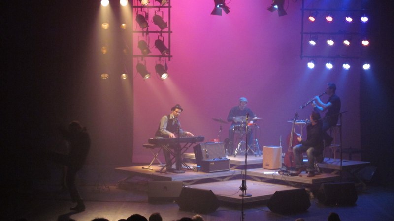 No Angry Young Man wou voor hun tour langs enkele Vlaamse cultuurcentra een bijzondere setting. In overleg met de groep kozen we voor een zeer compacte podiumbezetting. Door de muzikanten zeer dicht bij elkaar te plaatsen werd het contact onderling versterkt, maar verkregen we ook een mooier scenebeeld.